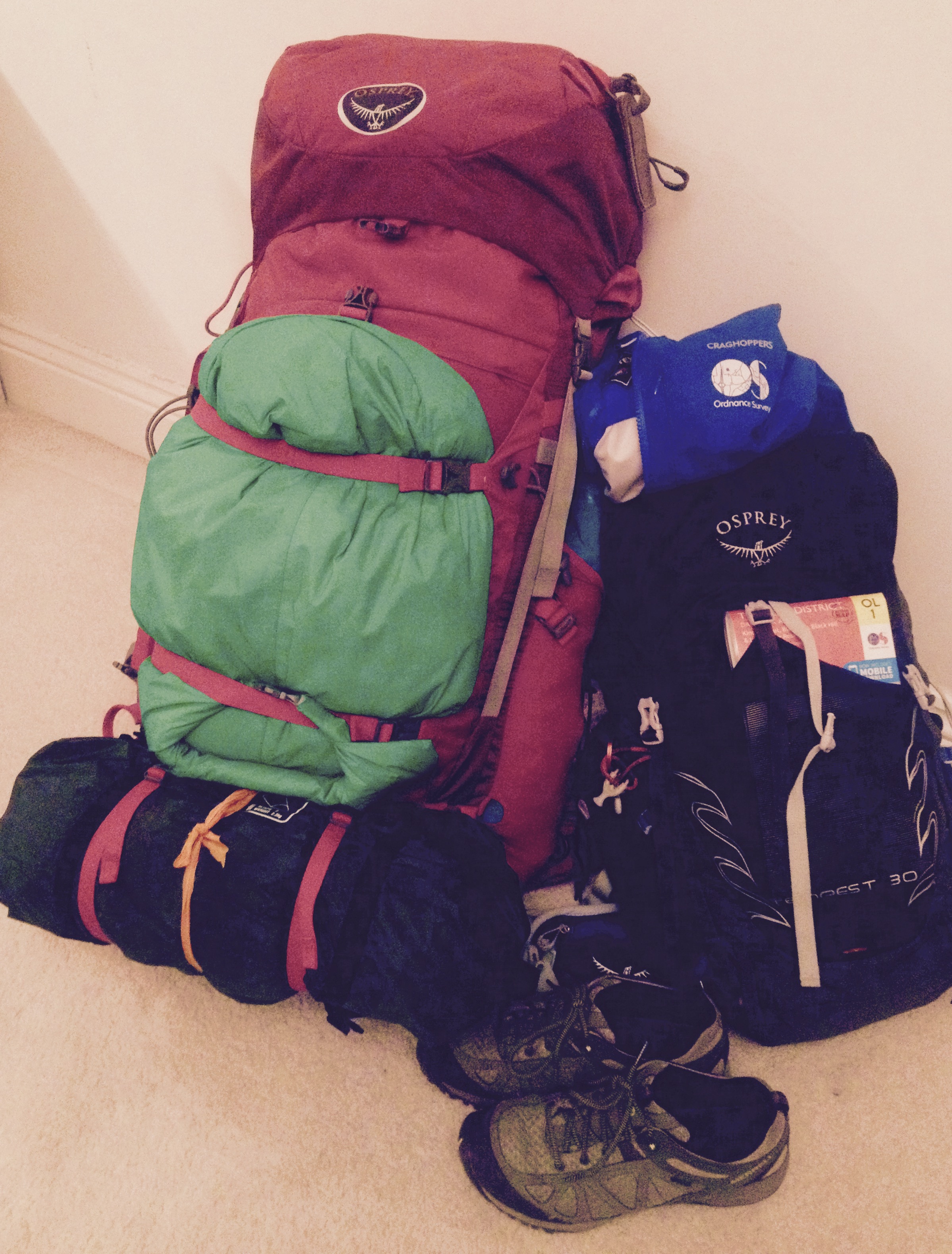 For some this simply won’t be an option. But it might work for you. The bags in this photo contain all the kit I recently took when heading off camping. Yep – all my gear. So that includes: tent, sleeping bag, roll mat, stove, cutlery, mess tin, wash kit and towel, thermals, layers, full waterproofs, hat, buff, gloves, clean tops, etc. As I was going climbing it also included climbing shoes, harness, helmet and chalk bag (but not ropes & gear). As I’m a writer and blogger, it also includes iPad, GoPro, notebook and solar charger. And as, bizarrely, I was going onto a posh do in London, it also includes my version (!) of evening smarts. It seems hard to believe, but it is all in there. So is it worth considering what you need to take, what you want to take and whether you might like to leave the car at home…?